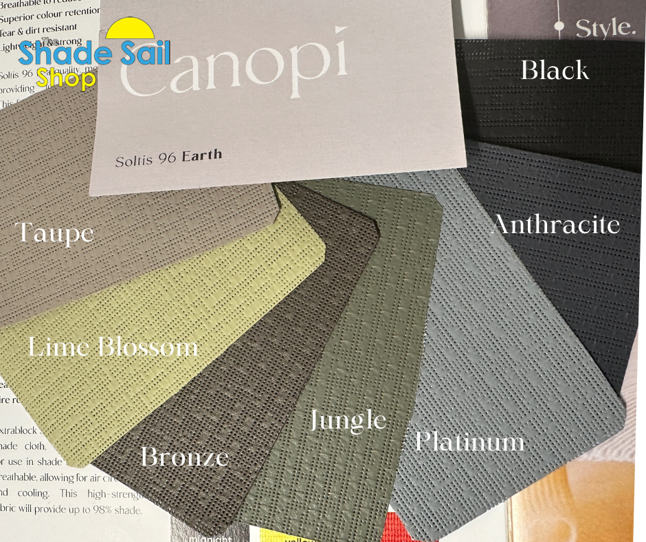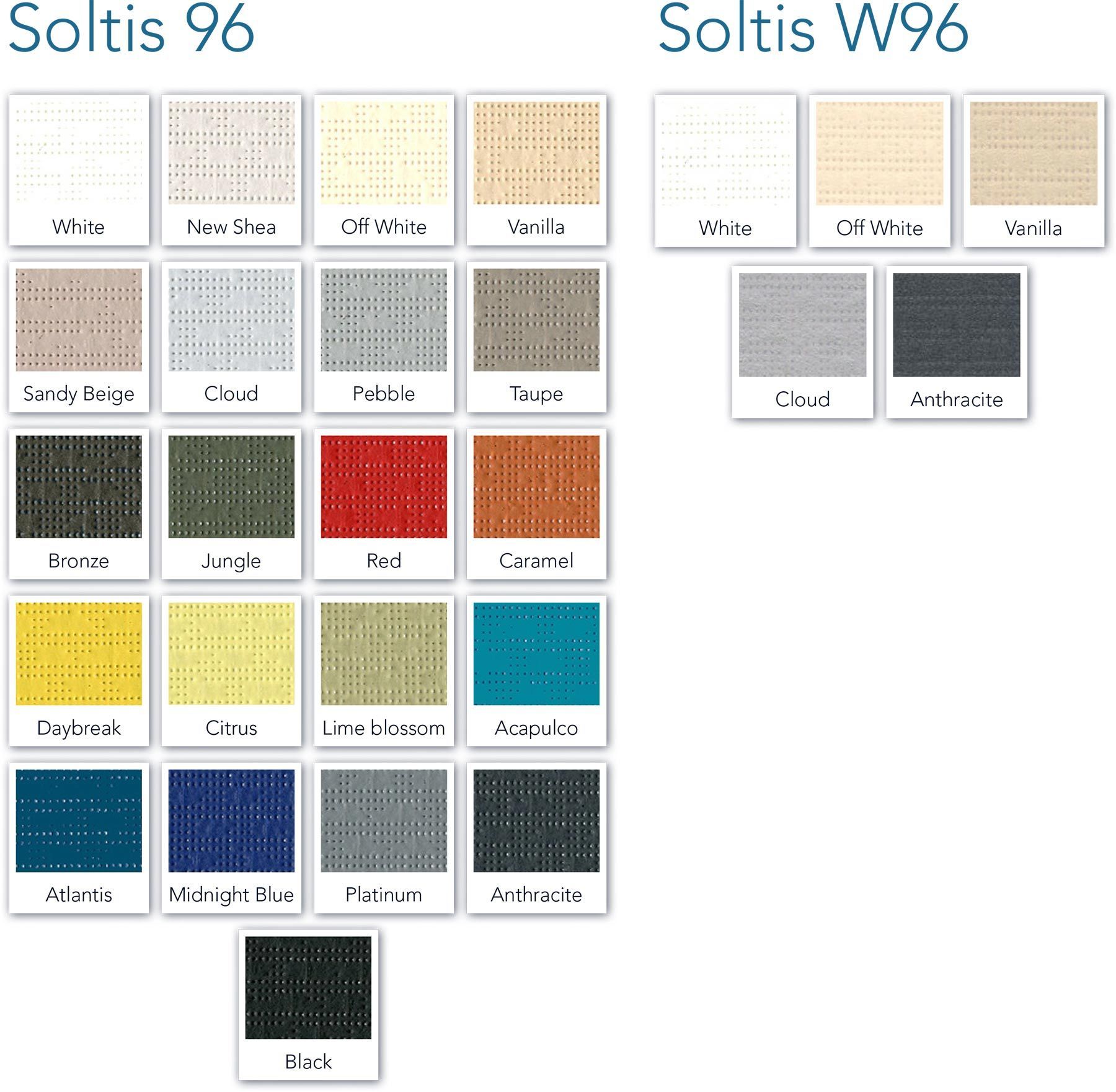 Wave Shade retractable shade covers are manufactured from Soltis 96 and Soltis W96. Soltis 96 is a premium high-performance mesh with a 4% openness factor. It is lightweight and features a double thickness solar protection coating provide longevity. Soltis W96 is the waterproof option, which is a popular choice for commercial installations. Colour options for each fabric are as follows: